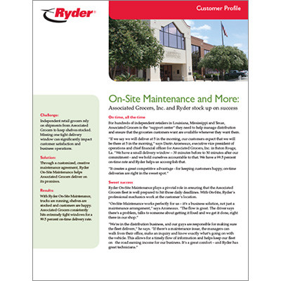 Independent retail grocers rely on shipments from Associated Grocers to keep shelves stocked. Missing one tight delivery window can significantly impact customer satisfaction and business operations. Through a customized, creative maintenance agreement, Ryder On-Site Maintenance helps Associated Grocers deliver on its promises.